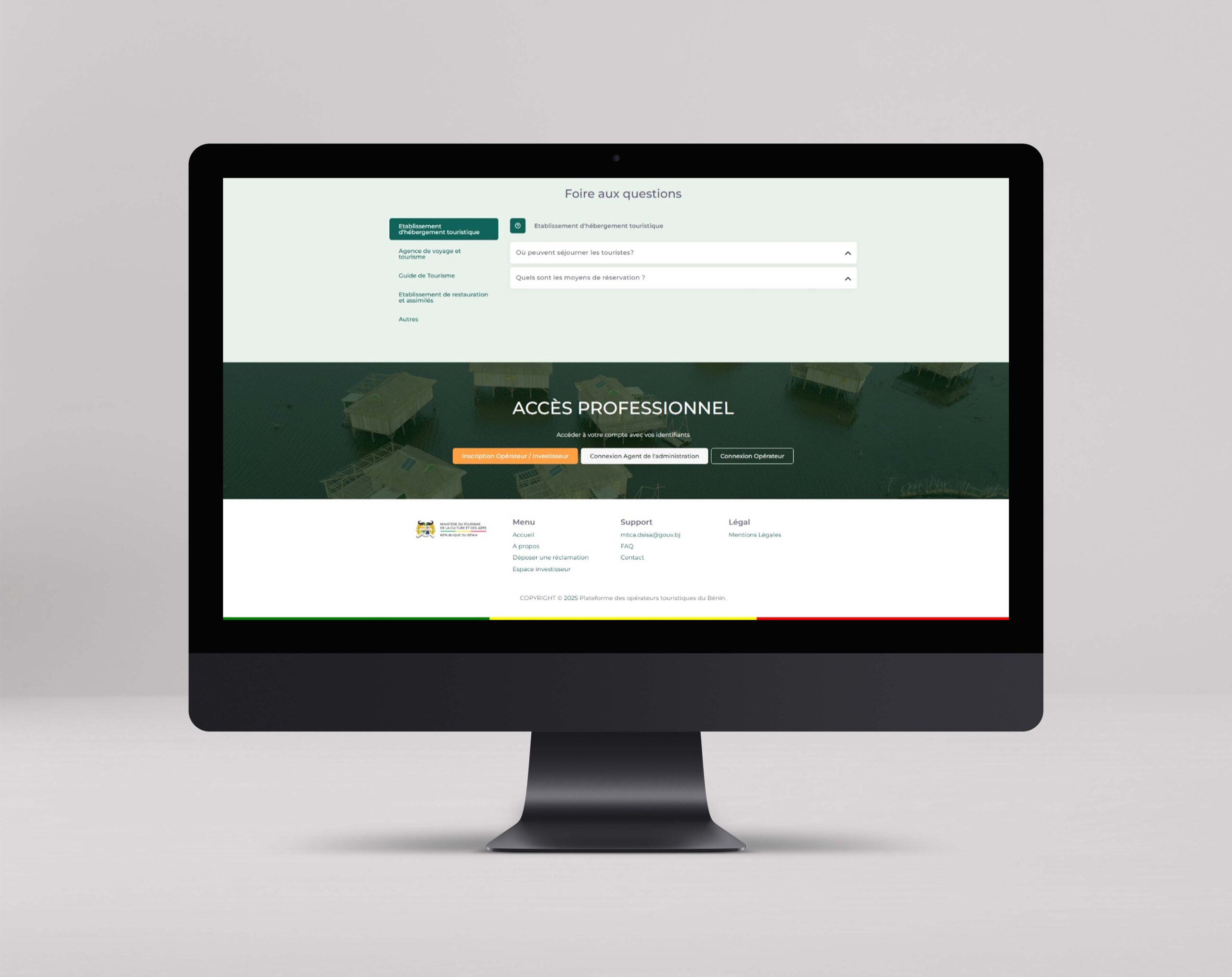 Elle est dédiée à la demande, au traitement et à la délivrance des licences et au classement des opérateurs touristiques du Bénin. Les langages utilisées sont: Application mobile(Flutter), Frontend (Vue.jus), Backend (Laravel) et Base de données (PostgreSQL).